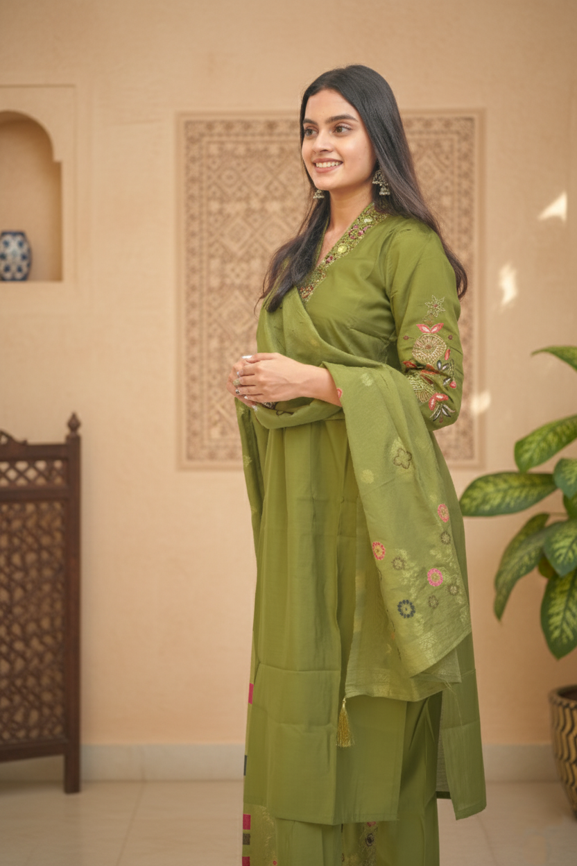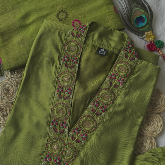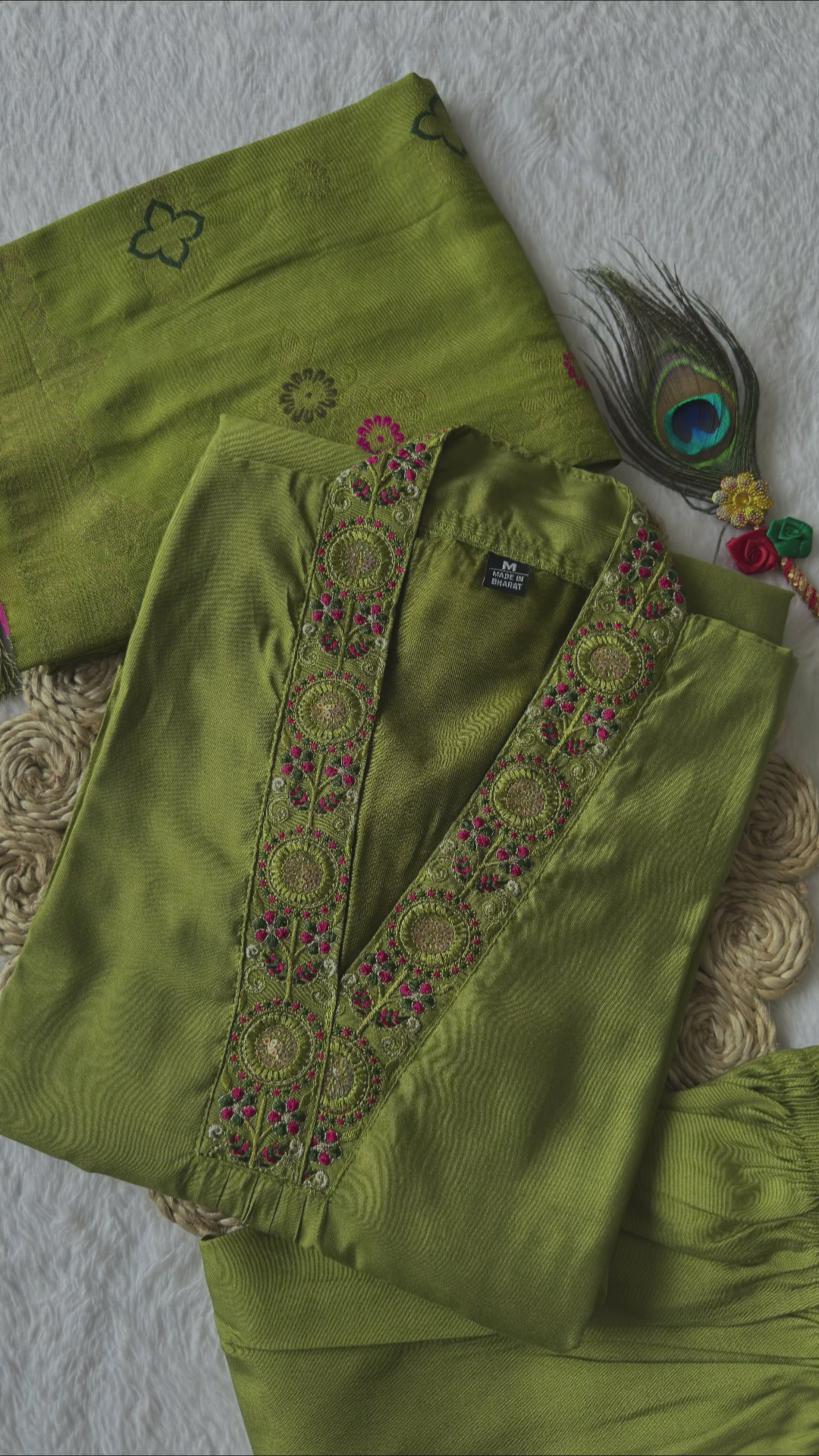| ✨FABRIC: Premium Roman Silk , ✨COLOUR: Light Mahendi , ✨DUPATTA : Hevay Quality Nylon Muslin Jecard With Latkan (2.30 Mtr), ✨WORK : Embroidery Sequence Work ✨,INNER : Cotton Inner (Full), ✨SIZE: M-38, L-40, XL-42, XXL-44, 👍100% QUALITY SATISFACTION GUARANTEED PRODUCT |