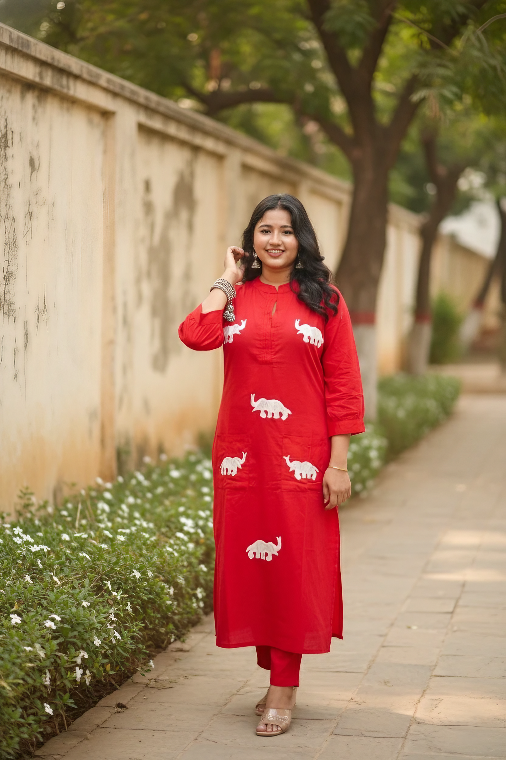 Red Kurta Set With White Elephant Embroidery Design